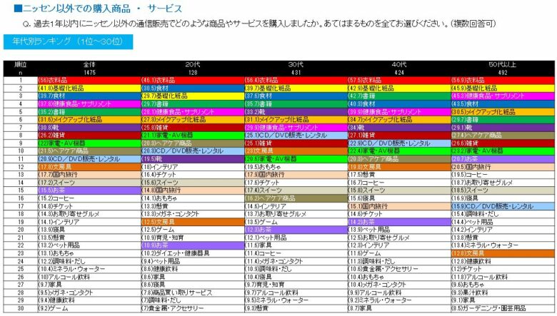 ニッセン以外の通信販売で購入したものの上位では「衣料品」「基礎化粧品」「食材」「健康食品・サプリメント」