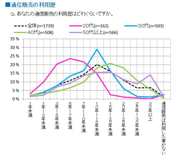 通販歴については20代で5年~7年未満、30代で10年~15年、40代・50代で15年~20年が多く、若い世代から継続して通販を利用していることが伺える。