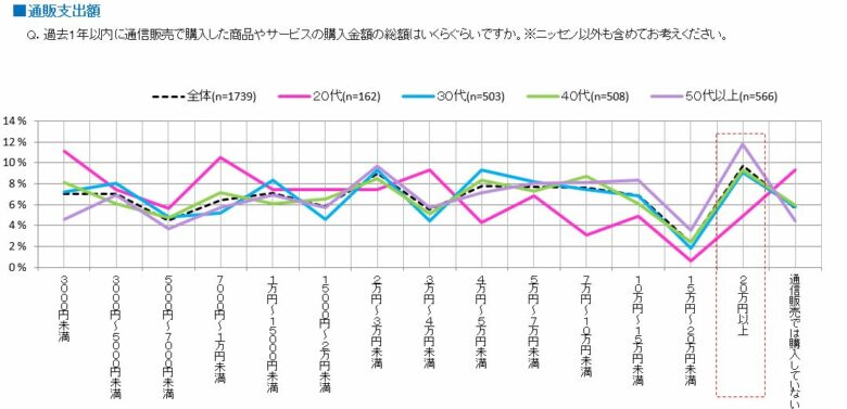 過去1年の間で通信販売での支出の総額は30代以上で20万円以上支出している割合が多く見られた。