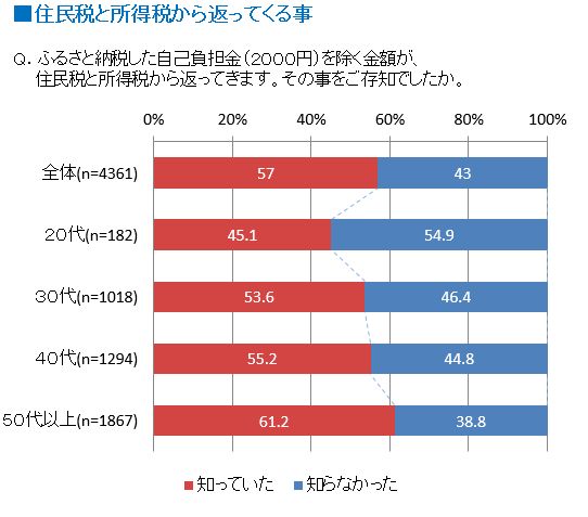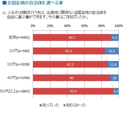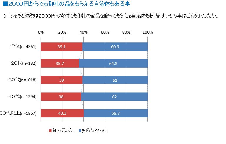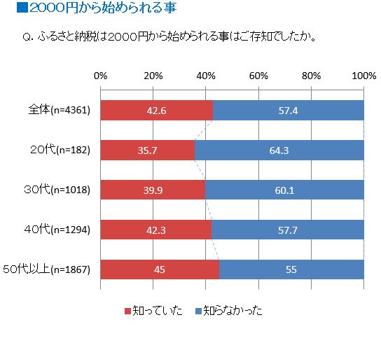 ふるさと納税は、2,000円から始めることができるが、そのことを知っている人は全体でも半数以下だった。