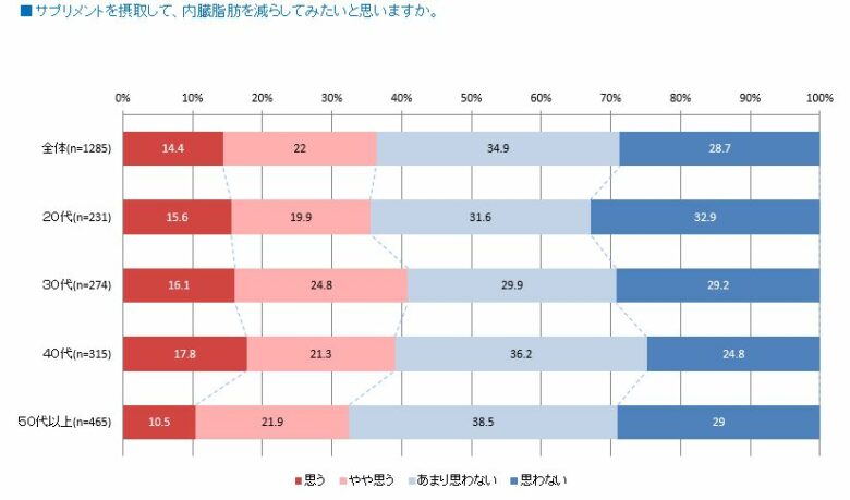 どの年代でもサプリメントを使用して内臓脂肪を減らしたいと思っている人は半数を下回った。
