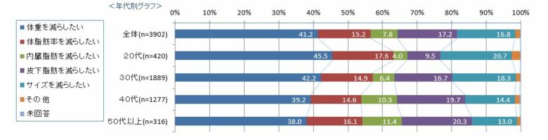 どの年代でも約40%前後の人が「体重を減らしたい」と回答した。