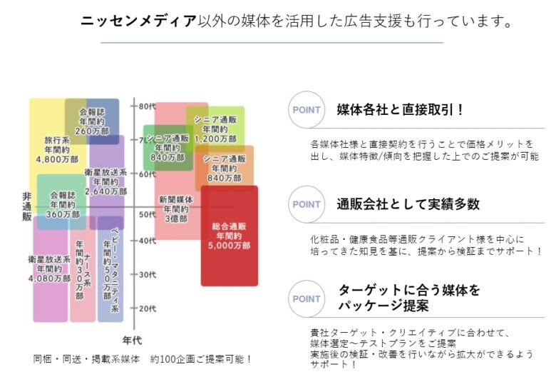 またニッセンは代理店機能もあり、約百媒体もの媒体を扱っており、様々なご提案が可能でございます。
