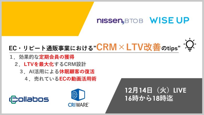 ニッセン(定期顧客開発)、ワイズアップ(CRM改善)、コラボス(休眠顧客復活)、CRI・ミドルウェア(CVR改善)の4社でお届けします。
