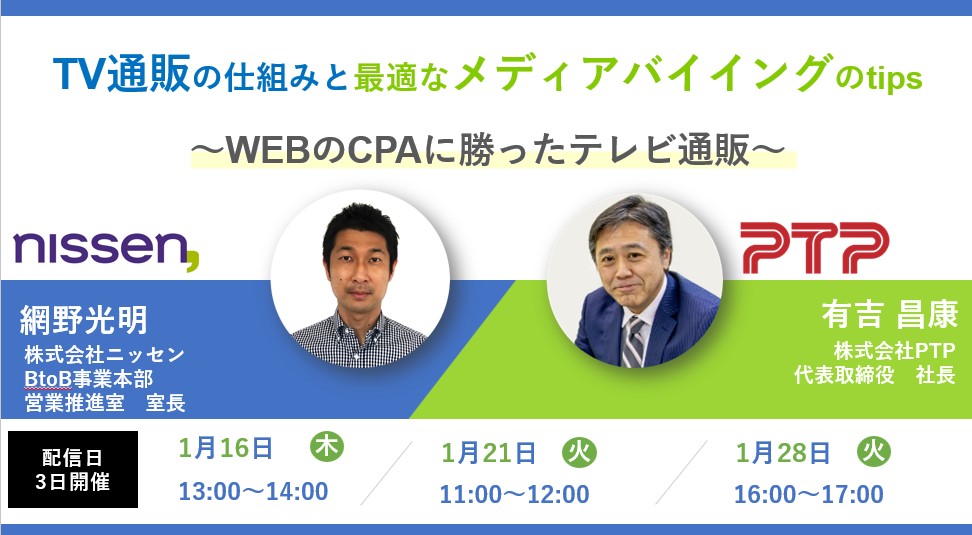 そして、PTPからは、テレビ通販で肝となる広告(メディア)運用におけるメディアバイイングの最適化や、競合のクリエイティブのトレンドを把握する手法など、KPI達成のための効果的なテレビ通販のtipsについてお話します。