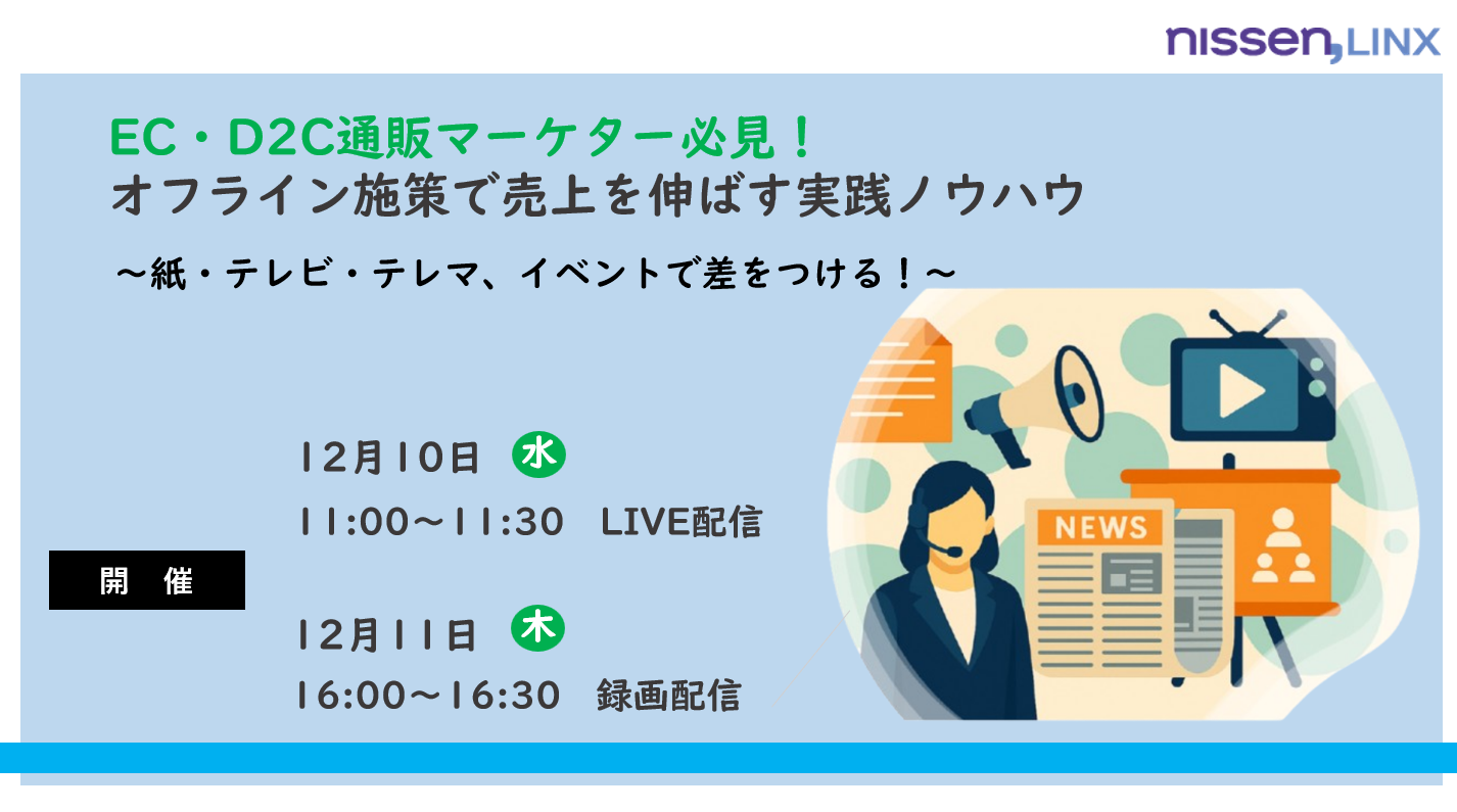 そこで本ウェビナーでは、通販会社ニッセンが実践する 紙媒体、テレビ通販、成果報酬型テレマーケティング、リアルイベント の成功事例を交えながら、オフラインマーケティング初心者の方にもわかりやすい 実践的なTips をお届けします。