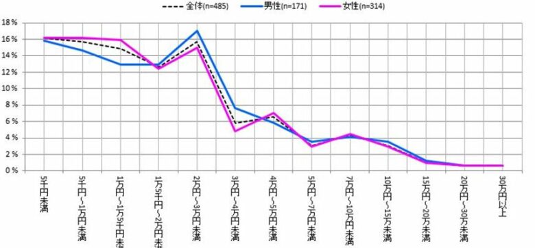 テレビショッピングでの購入金額は「5千円未満」「5千円〜1万円未満」「2万円〜3万円未満」が最も高い結果となりました。