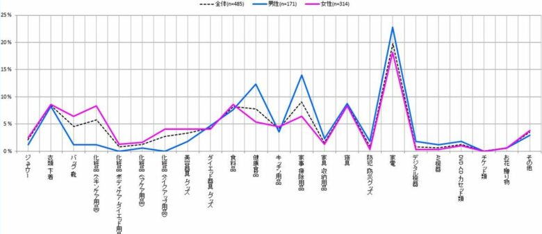 男女ともに「家電製品」が圧倒的に高い結果に。