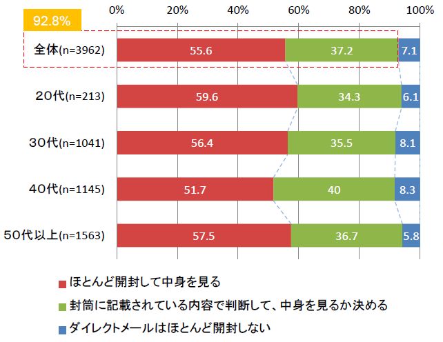 DMはほとんど開封しないは7.1%となっており、9割以上の方が届いたDMに対して 開封している事がわかりました。