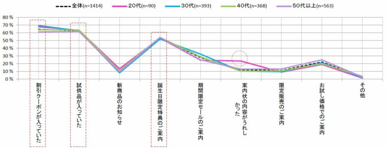 「割引クーポンが入っていた」、「試供品が入っていた」、「誕生日限定の特典案内があった」などが
