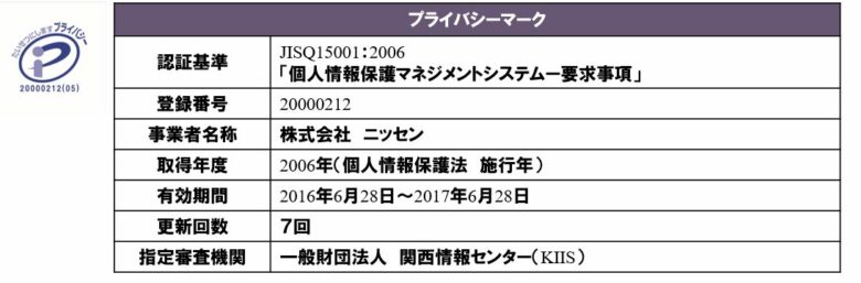 株式会社ニッセンは、Pマークを認証取得済み。