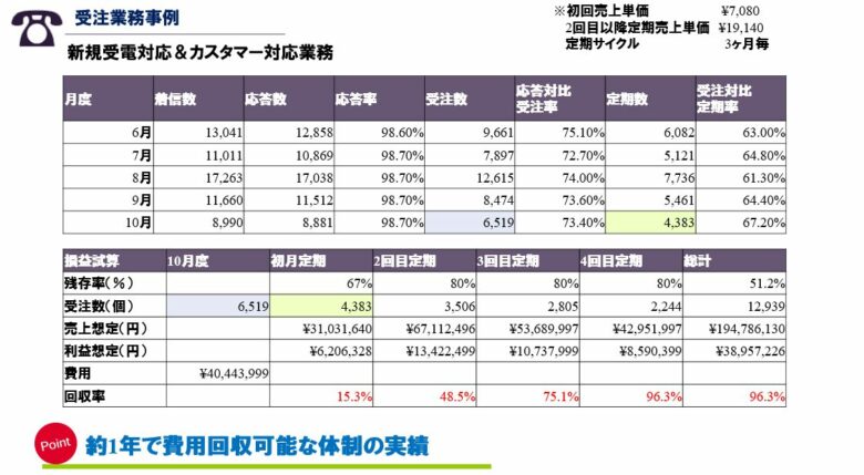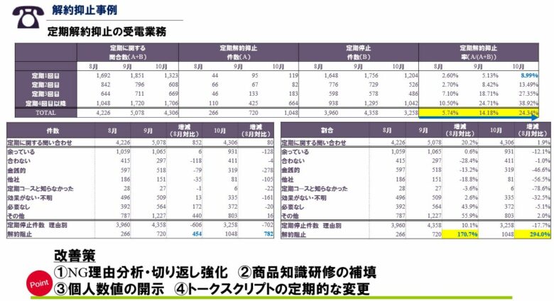 ⇒定期顧客会員様からの解約のお電話に関して、NG理由の分析から抑止します。