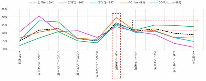 全体としては「1年~2年未満」同じ商品を購入している傾向がある。