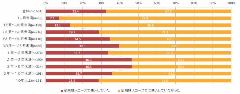 最も長く続けた健康食品でも定期購入コースで購入していた率は半数を切っている。