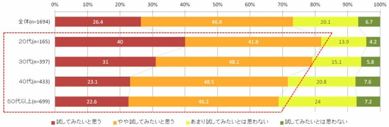 「試してみたい」と「やや試してみたい」をあわせて、おおよそ70%以上と高い。