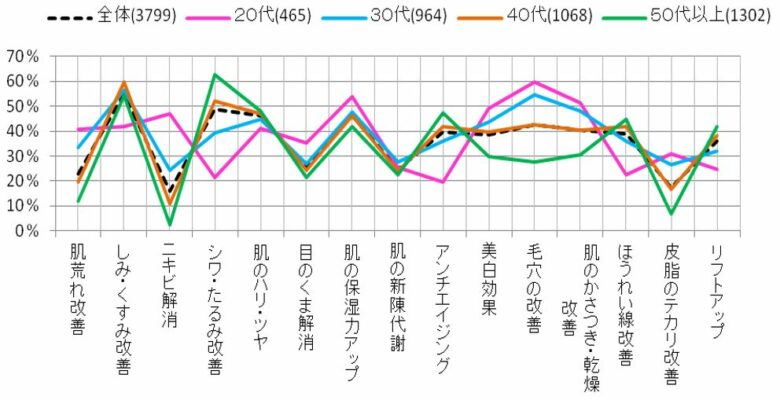 20代では毛穴の改善が最も高いが、年代が高くなるにつれて、
