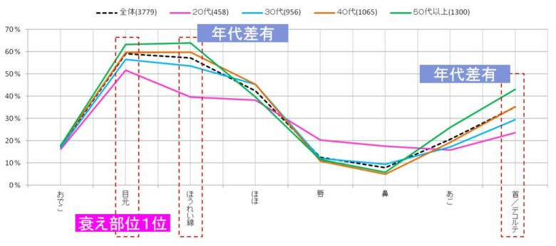 どの年代でも衰えを感じる部分は目元が高くなっている。