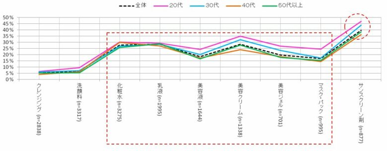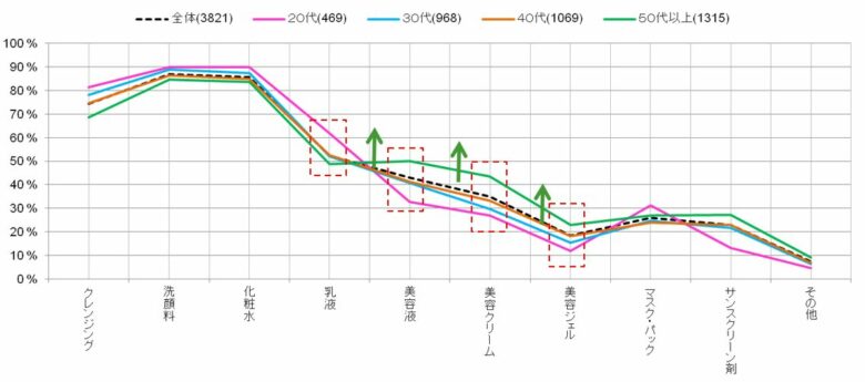 保湿を高める為に使用する「乳液」「美容液」「美容クリーム」「美容ジェル」については年代による差がみられ、年代が高くなるほど、「美容液」「美容クリーム」「美容ジェル」の使用率が高くなる傾向がみられた。