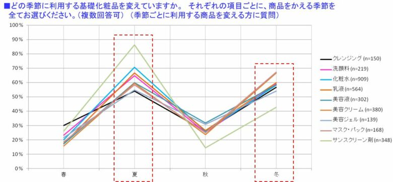 クレンジング、洗顔料以外は、季節によって2割~3割程度、利用する商品を変えている傾向が見られる。