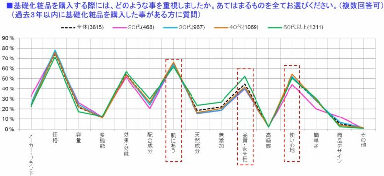 基礎化粧品を購入する際には、価格以外に「効果効能」「肌に合う」「使い心地」「品質・安全性」が重視項目として高くなっており傾向としては直接肌にふれるものであることから肌への影響を重視する傾向が見られる。