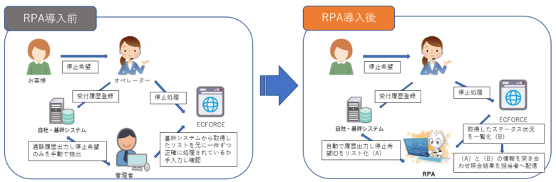 RPA導入イメージ図:定期購入停止希望受付時の自動化例…管理者による処理確認のダブルチェック、月間120時間分削減に成功。