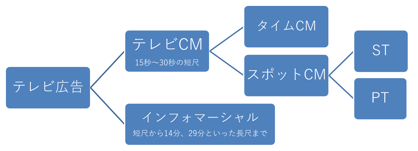 テレビ広告は大きく分けて15秒、30秒、60秒、120秒のテレビCMや、5分のミニ番組、そして主に通販企業が利用している、14分、29分などインフォマーシャルに分けられます。