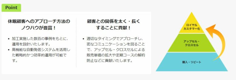 アップセル/クロスセル、休眠からの復活客の発掘を行い、リストメンテナンスにも貢献しております。